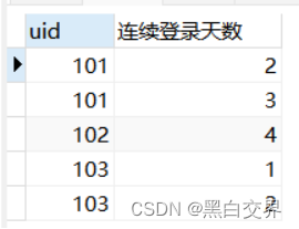 (4)之后我们对得到的查询结果,按照用户id,登录时间进行分组计数,得到的计数结果就是用户连续登录多少天的情况记录。