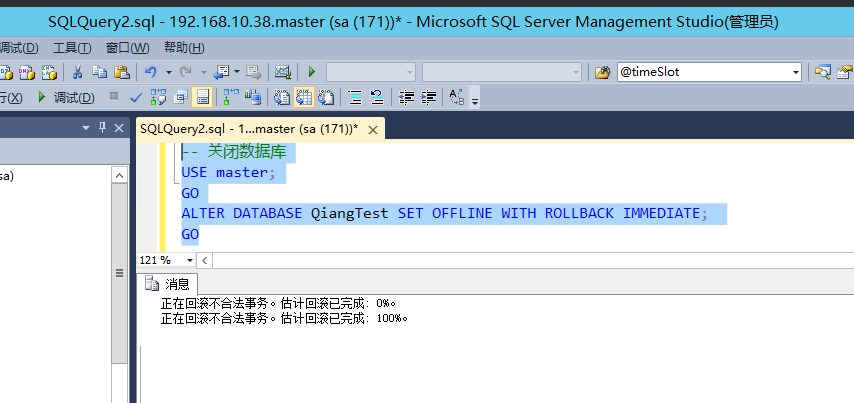 -- 关闭数据库 USE master; GO ALTER DATABASE QiangTest SET OFFLINE WITH ROLLBACK IMMEDIATE; GO
