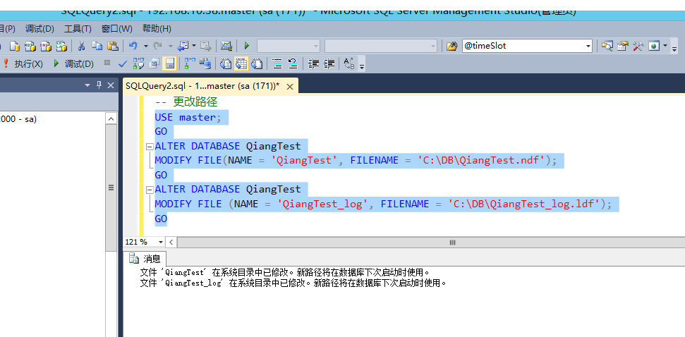 -- 更改路径 USE master; GO ALTER DATABASE QiangTest MODIFY FILE(NAME = 'QiangTest', FILENAME = 'C:\DB\QiangTest.ndf'); GO ALTER DATABASE QiangTest MODIFY FILE (NAME = 'QiangTest_log', FILENAME = 'C:\DB\QiangTest_log.ldf'); GO