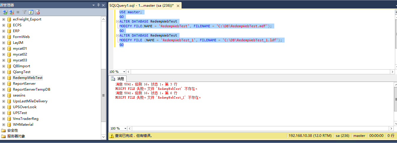 消息 5120,级别 16,状态 101,第 29 行 无法打开物理文件“D:\db\Test\RedempWebTest.mdf”。操作系统错误 5:“5(拒绝访问。)”。 消息 5120,级别 16,状态 101,第 29 行 无法打开物理文件“D:\db\Test\RedempWebTest_1.ldf”。操作系统错误 5:“5(拒绝访问。)”。 消息 5181,级别 16,状态 5,第 29 行 无法重新启动数据库“RedempWebTest”。将恢复到以前的状态。 消息 5069,级别 16,状态 1,第 29 行 ALTER DATABASE 语句失败。