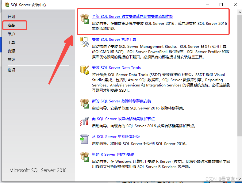 打开SQL Server 安装中心----侧边栏选择“安装”----右边选择“全新SQL Server 独立式安装或向现有安装添加功能”。