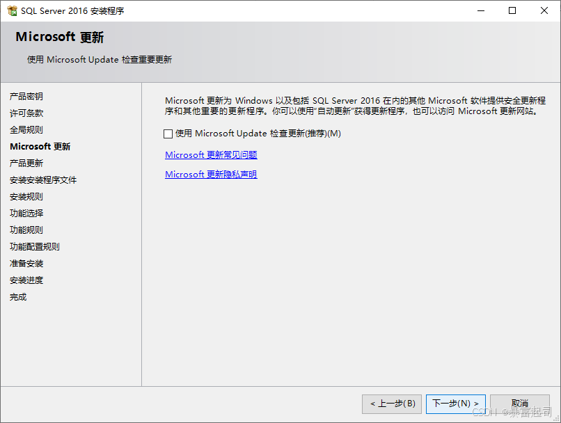 按自己习惯,看是否勾选“使用 Microsoft Update检查更新”---点击下一步