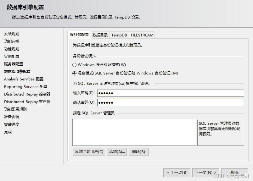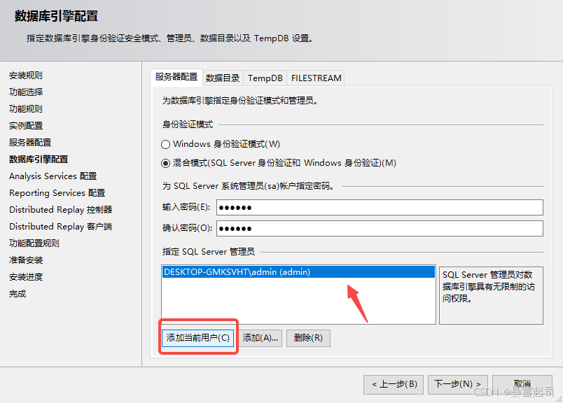 勾选“混合模式(SQL Server身份验证和Windows身份验证)”---根据自身喜好看是否设置密码---点击下图所框起来的“添加当前用户”---点击下一步