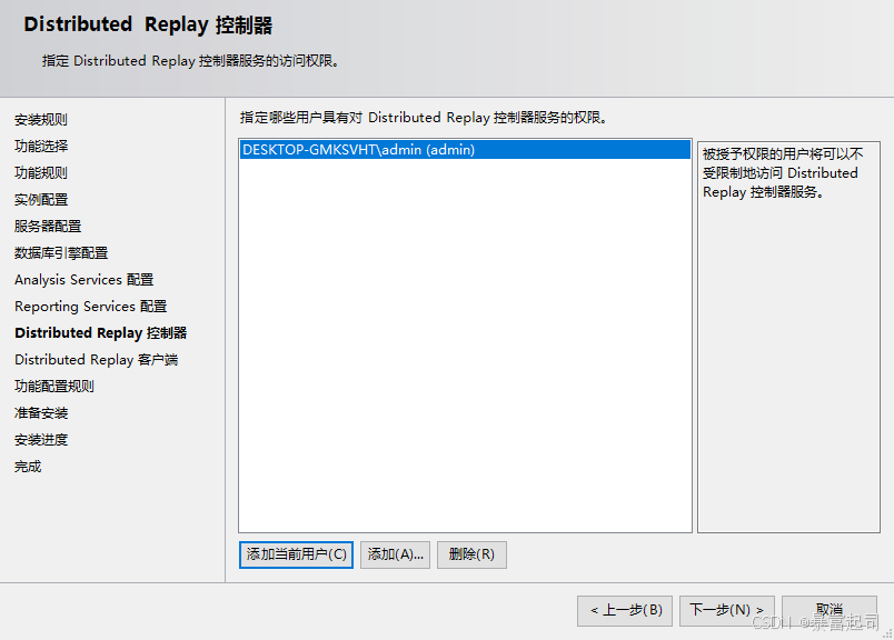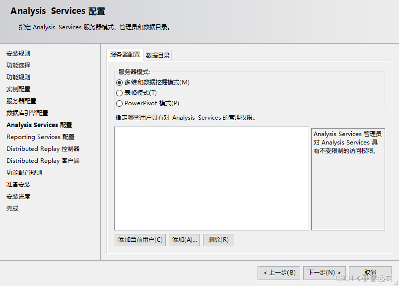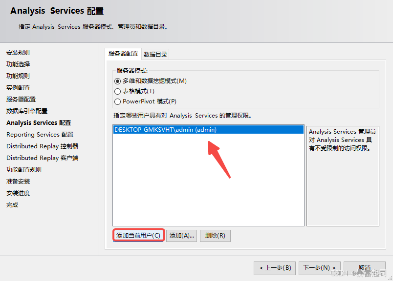 勾选“多维和数据挖掘模式”---点击“添加当前用户”---点击下一步