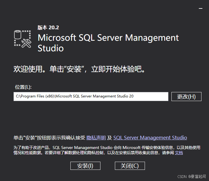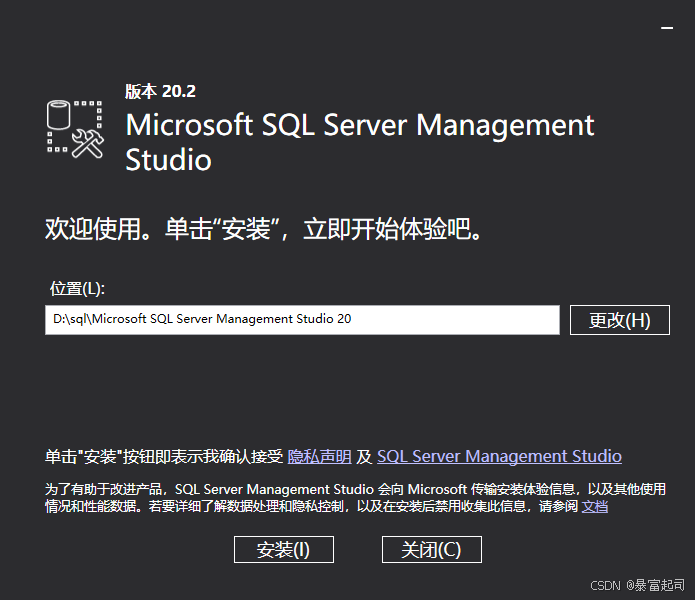 安装SQL Server Management Studio,更改安装位置,点击安装