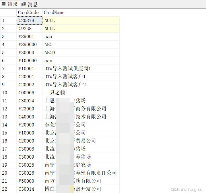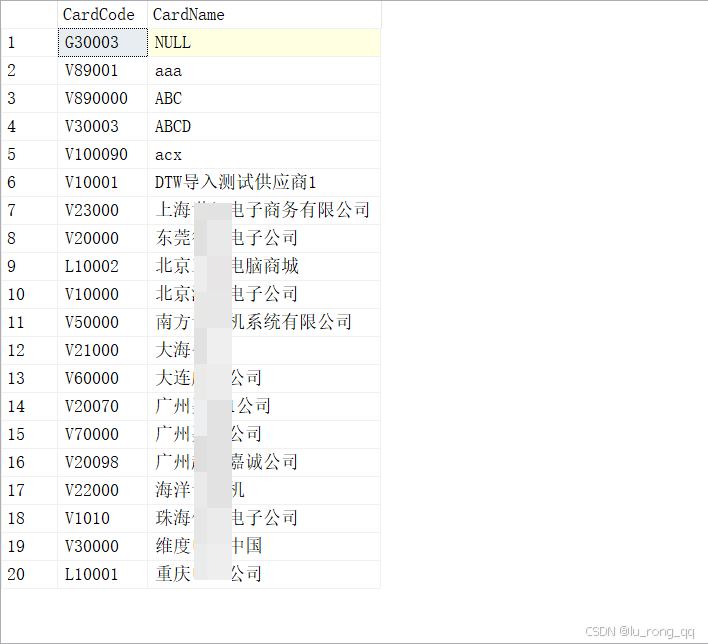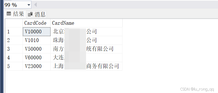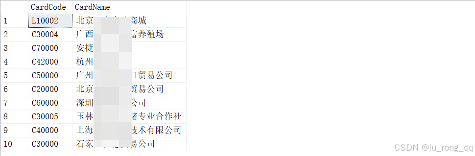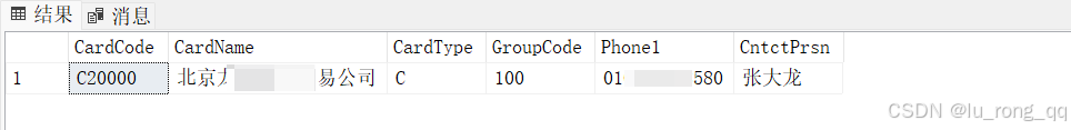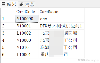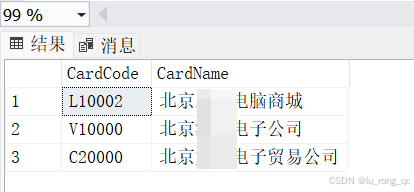 SELECT CardCode,CardName FROM OCRD WHERE CardName LIKE N'%京%' --查询内容为中文字符时需要增加前缀“N”才能被sql server识别