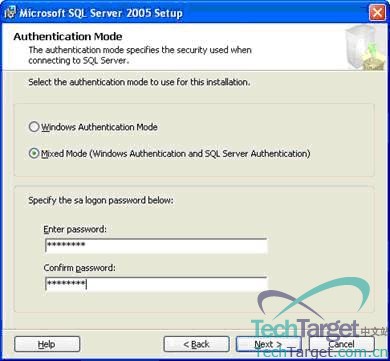 ◆在步骤3中,选择认证模式。有两个选项,分别是Windows认证模式或者混合模式(Windows和SQL Server认证)。在Windows认证模式下,只有Windows账号才可以拥有登录SQL Server的权限,在混合模式下,Windows和SQL Server的账号都可以理所当然地拥有登录到SQL Server的权限。