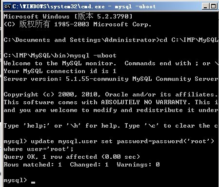 6.改密码:>updateusersetpassword=password("123456")whereuser="root";(别忘了最后的分号)