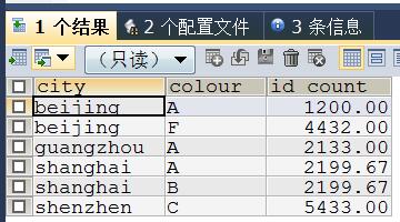 #多列分类汇总 SELECT city,colour,ROUND(SUM(price),2) AS id_count FROM data1 GROUP BY city,colour;