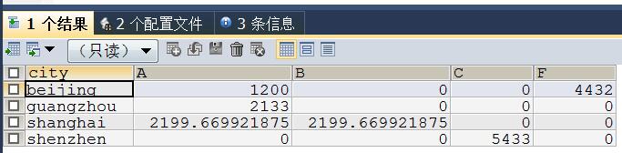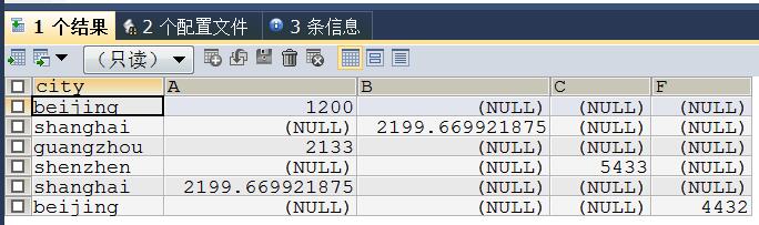 #对空值进行处理 CREATE VIEW data1_Extended_Pivot_Pretty AS ( SELECT city, COALESCE(A, 0) AS A, COALESCE(B, 0) AS B, COALESCE(C, 0) AS C, COALESCE(F, 0) AS F FROM data1_Extended_Pivot );
