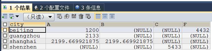 #使用CASE WHEN进行数据透视 CREATE VIEW data_Items AS ( SELECT data1.city, CASE WHEN colour = "A" THEN price END AS A, CASE WHEN colour = "B" THEN price END AS B, CASE WHEN colour = "C" THEN price END AS C, CASE WHEN colour = "F" THEN price END AS F FROM data1 );