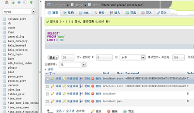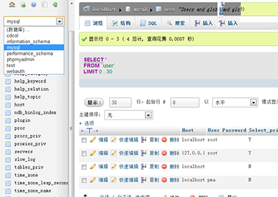 在浏览器地址上输入http://localhost/phpmyamdin 进入到数据库控制面板,然后选择名称为mysql数据库,如图,可从中看出 user表中,root的两个用户的密码为空。