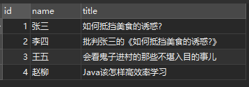 insert into table_name(id, name, title) values (1, '张三', '如何抵挡美食的诱惑?'), (2, '李四', '批判张三的《如何抵挡美食的诱惑?》'), (3, '王五', '会看鬼子进村的那些不堪入目的事儿'), (4, '赵柳', 'Java该怎样高效率学习');