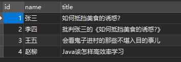 create temporary table tmp(id int(4) primary key,name varchar(50),title varchar(50)); insert into tmp(id, name, title) values (1, '张三', '如何抵挡美食的诱惑?'), (2, '李四', '批判张三的《如何抵挡美食的诱惑?》'), (3, '王五', '会看鬼子进村的那些不堪入目的事儿'), (4, '赵柳', 'Java该怎样高效率学习');