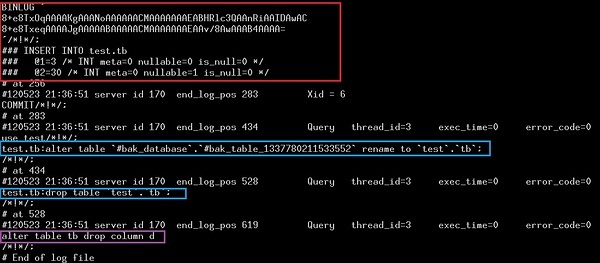 两个蓝色框中的即为我们生成的FLASHBACK_EVENT。除了event_type与普通的query_event不同,还将库名+表名放在语句的前面,目的是为了flashback工具执行按表闪回的时候可以直接识别表名,不需要解析binlog语句。