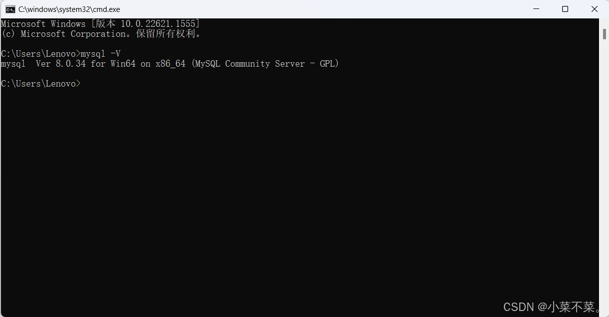 1.2输入 mysql -V 后点击Enter键跳出MySQL的版本,比如我现在的版本就是8.0.34