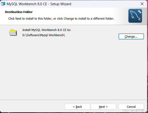3.2 点击Next 到安装路径界面,在这里选择将MySQL Workbench安装到哪里