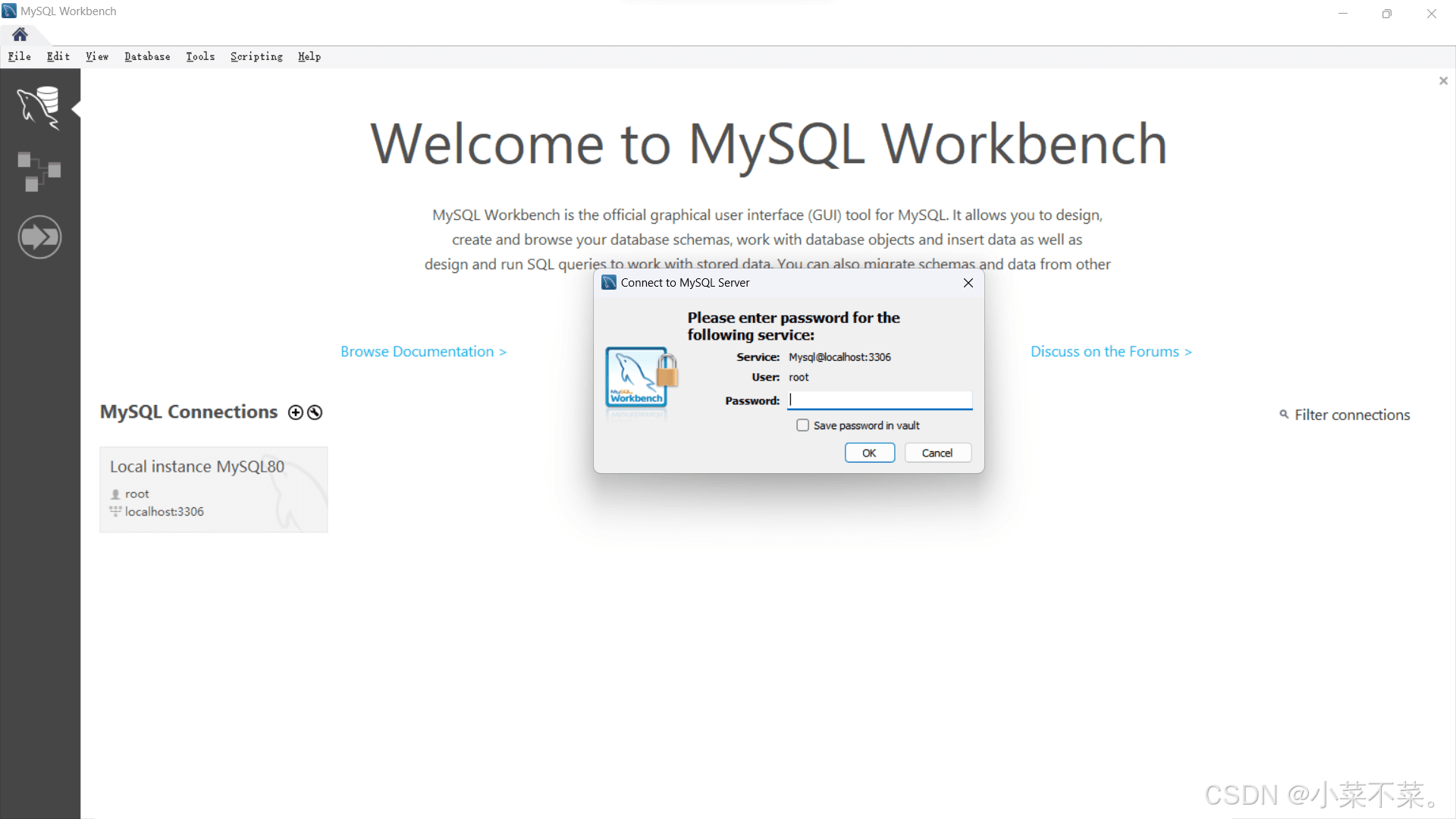 4.2这里可以直接点击界面中间的Local instance MySQL80 或者点击那个加号添加用户,在跳出的界面中输入数据库的密码即可