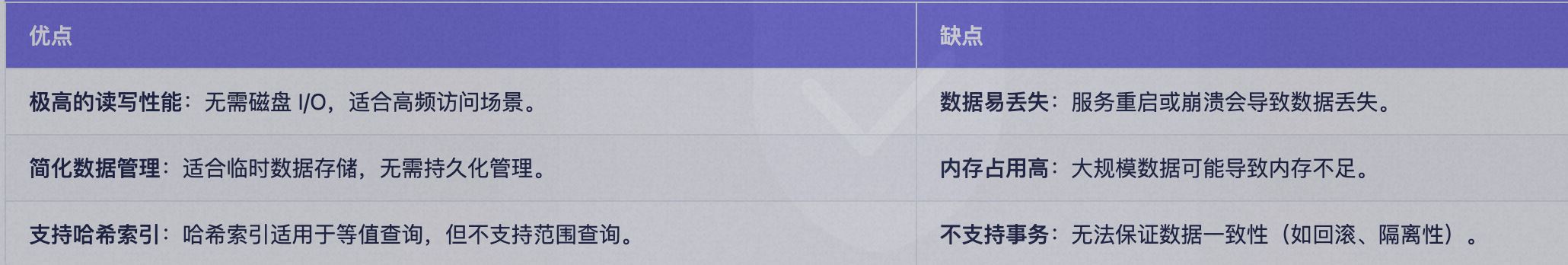 - 数据和索引均存在于内存中,无磁盘 I/O 开销。
