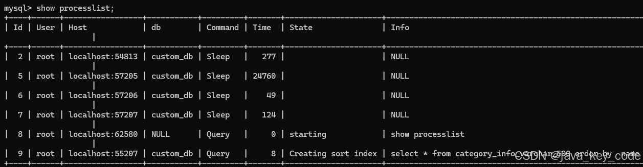 | command | 显示当前连接的执行的命令,一般就是休眠(sleep),查询(query),连接(connect) |