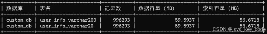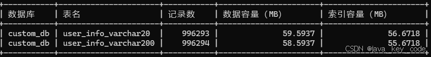 CREATE TABLE `user_info_varchar20` ( `id` bigint(20) NOT NULL AUTO_INCREMENT COMMENT 'ID', `name` varchar(20) NOT NULL COMMENT '用户名', `age` tinyint(4) NOT NULL DEFAULT 0 COMMENT '年龄', `sex` tinyint(2) NOT NULL DEFAULT 0 COMMENT '性别 0:男 1: 女', `create_time` datetime NOT NULL DEFAULT NOW() COMMENT '创建时间', `udpate_time` datetime NOT NULL DEFAULT NOW() COMMENT '更新时间', PRIMARY KEY (`id`), KEY `idx_name` (`name`) COMMENT 'name索引' ) ENGINE=InnoDB DEFAULT CHARSET=utf8 COMMENT='用户账户'; CREATE TABLE `user_info_varchar200` ( `id` bigint(20) NOT NULL AUTO_INCREMENT COMMENT 'ID', `name` varchar(200) NOT NULL COMMENT '用户名', `age` tinyint(4) NOT NULL DEFAULT 0 COMMENT '年龄', `sex` tinyint(2) NOT NULL DEFAULT 0 COMMENT '性别 0:男 1: 女', `create_time` datetime NOT NULL DEFAULT NOW() COMMENT '创建时间', `udpate_time` datetime NOT NULL DEFAULT NOW() COMMENT '更新时间', PRIMARY KEY (`id`), KEY `idx_name` (`name`) COMMENT 'name索引' ) ENGINE=InnoDB DEFAULT CHARSET=utf8 COMMENT='用户账户';