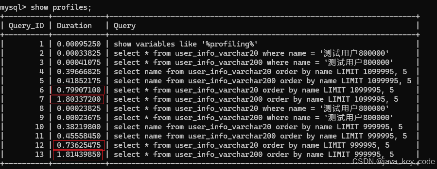 -- 条件为索引字段查询 select * from user_info_varchar20 where name = '测试用户800000'; select * from user_info_varchar200 where name = '测试用户800000'; -- 排序字段为索引同时搜索字段为索引覆盖(深分页) select name from user_info_varchar20 order by name LIMIT 999995, 5; select name from user_info_varchar200 order by name LIMIT 999995, 5; -- 排序字段为索引同时搜索字段为普通字段(深分页) select * from user_info_varchar20 order by name LIMIT 999995, 5; select * from user_info_varchar200 order by name LIMIT 999995, 5;
