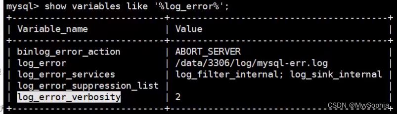 [root@localhost ~]# mkdir -p /data/3306/log/ [root@localhost ~]# chown -R mysql.mysql /data/ [root@localhost ~]# /etc/init.d/mysqld restart Shutting down MySQL.... [ OK ] Starting MySQL.2021-11-20T14:58:53.264890Z mysqld_safe error: log-error set to '/data/3306/log/mysql-err.log', however file don't exists. Create writable for user 'mysql'. The server quit without updating PID file (/data/3306/data/[FAILED]t.localdomain.pid). [root@localhost ~]# touch /data/3306/log/mysql-err.log [root@localhost ~]# chown -R mysql. /data/ [root@localhost ~]# /etc/init.d/mysqld restart 错误日志: 启动故障 主从故障 死锁 数据库hang,堆栈信息 主要关注: [ERROR] [ERROR] [MY-000068] [Server] unknown option ---》 配置文件有问题 日志记录级别 mysql> show variables like '%log_error%'; +----------------------------+----------------------------------------+ | Variable_name | Value | +----------------------------+----------------------------------------+ | binlog_error_action | ABORT_SERVER | | log_error | /data/3306/log/mysql-err.log | | log_error_services | log_filter_internal; log_sink_internal | | log_error_suppression_list | | | log_error_verbosity | 2 | +----------------------------+----------------------------------------+ 5 rows in set (0.00 sec)