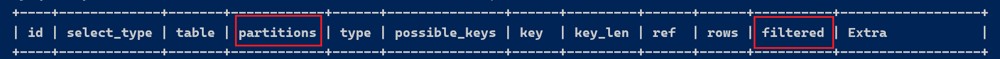- 在5.7以前的版本中,想要显示partitions 需要使用explain partitions 命令;想要显示filtered 需要使用explain extended 命令。在5.7版本后,默认explain直接显示partitions和filtered中的信息。