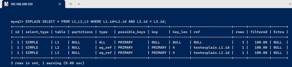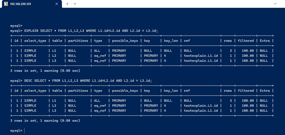 EXPLAIN SELECT * FROM L1,L2,L3 WHERE L1.id=L2.id AND L2.id = L3.id; DESC SELECT * FROM L1,L2,L3 WHERE L1.id=L2.id AND L2.id = L3.id;