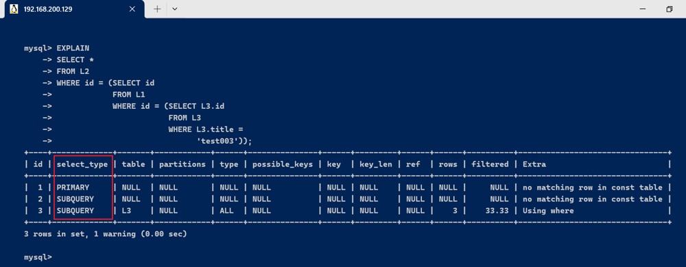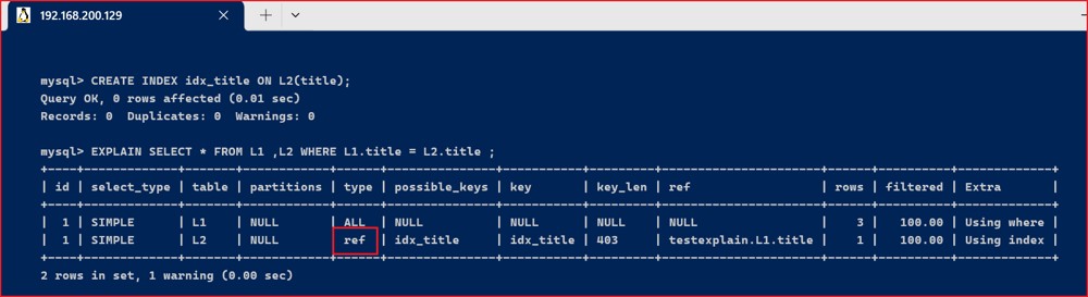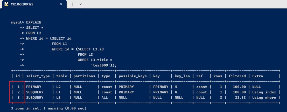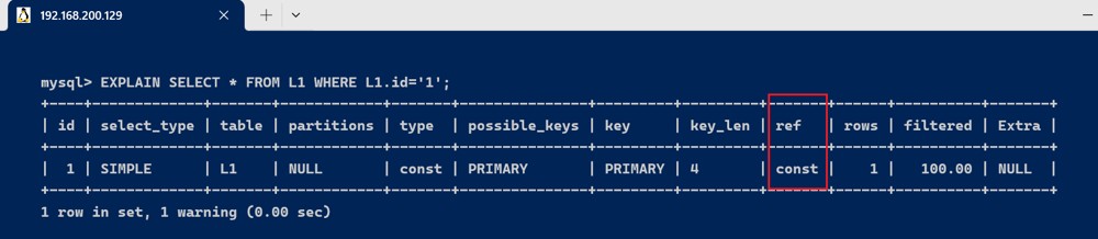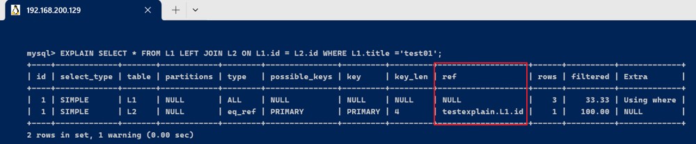 - L2表被关联查询的时候,使用了主键索引, 而值使用的是驱动表(执行计划中靠前的表是驱动表)L1表的ID, 所以 ref = test_explain.L1.id
