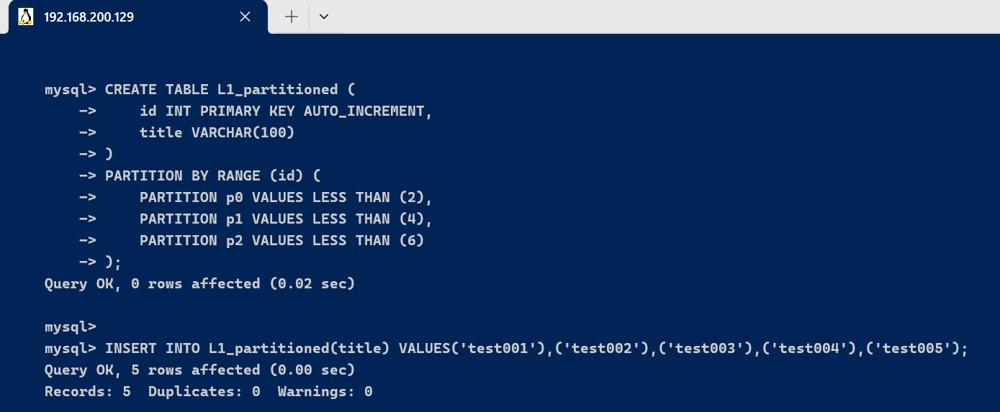 INSERT INTO L1_partitioned(title) VALUES('test001'),('test002'),('test003'),('test004'),('test005');
