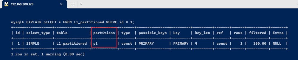 此查询会显示 partitions 字段的值为 p1,因为 id=3 的记录被存储在 p1 分区中。