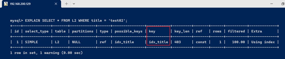 EXPLAIN SELECT * FROM L1 LEFT JOIN L2 ON L1.id = L2.id WHERE L1.title ='test01';