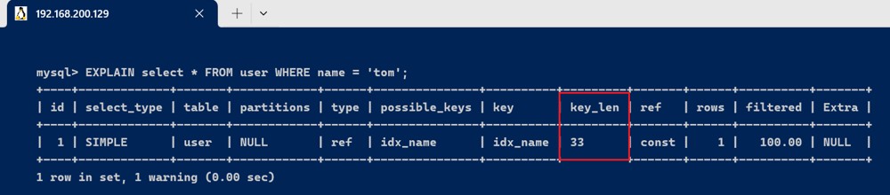 由于联合索引,根据最左匹配原则,使用到索引只有name这一列,name的字段类型是varchar(10),允许Null,字符编码是utf8,一个字符占用3个字节,varchar为动态类型,key长度加2,key_len = 10 * 3+2 + 1 = 33 。