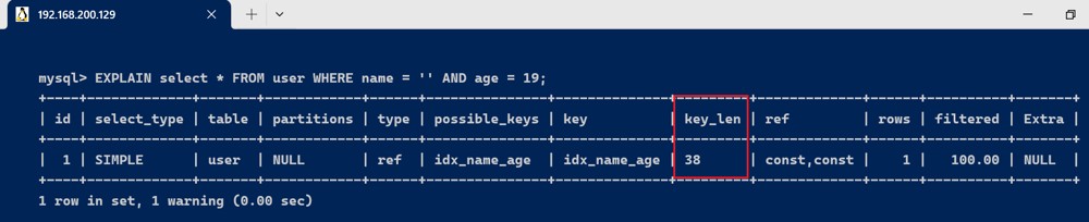 由于联合索引,使用到(name,age)联合索引,name的字段类型是varchar(10),允许Null,字符编码是utf8,一个字符占用3个字节,varchar为动态类型,key长度加2,key_len = 10 * 3 + 2 + 1 = 33 ,age的字段类型是int,长度为4,允许Null ,key_len = 4 + 1 = 5 。联合索引的key_len 为 key_len = 33+5 = 38。