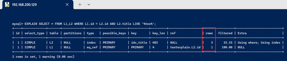 EXPLAIN SELECT * FROM L1,L2 WHERE L1.id = L2.id AND L2.title LIKE '%tes%';