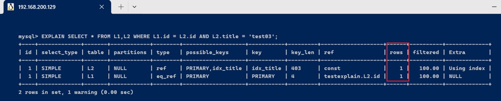 EXPLAIN SELECT * FROM L1,L2 WHERE L1.id = L2.id AND L2.title = 'test03';