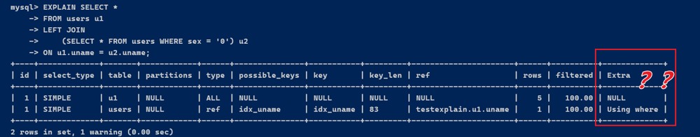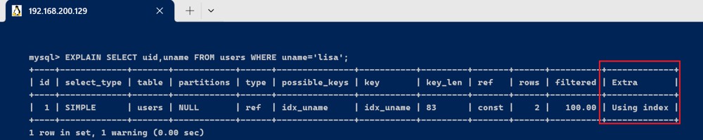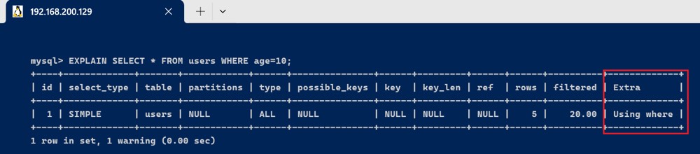 此语句的执行结果Extra为Using where,表示使用了where条件过滤数据。需要注意的是:
