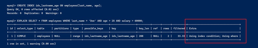EXPLAIN SELECT * FROM employees WHERE last_name = 'Doe' AND age > 25 AND salary > 60000;