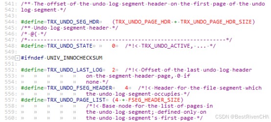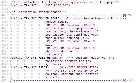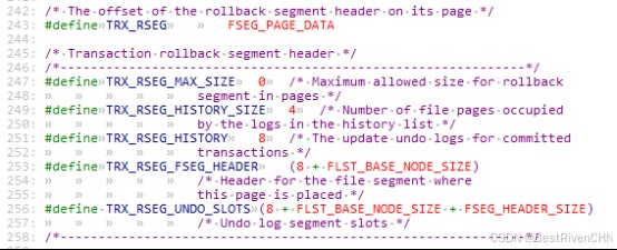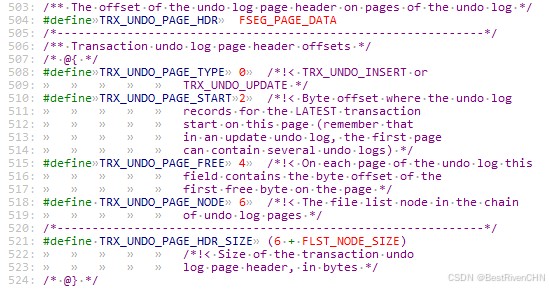 对于每一个回滚段,即上面TRX_SYS_RSEGS数组中的一个元素,也有其自己的存储格式,代码中的宏定义位于trx0rseg.h,格式如下: