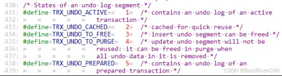 TRX_UNDO_STATE | undo段五种状态,包括TRX_UNDO_ACTIVE\CACHED\TO_FREE\TO_PURGE\PREPARED |