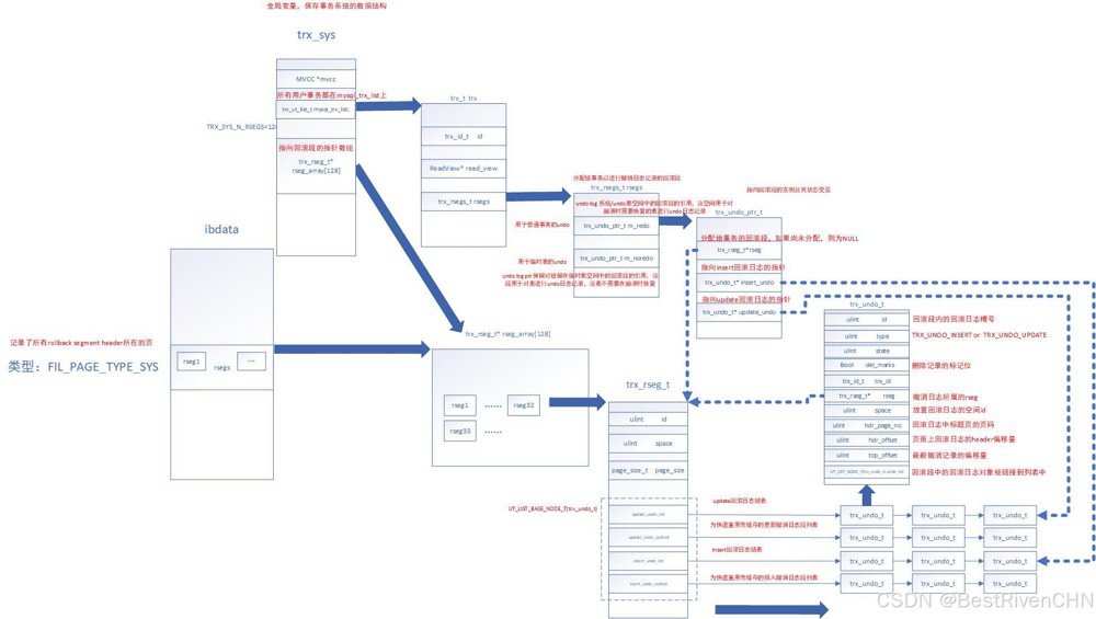与undo log相关的数据结构有trx_sys_t、trx_rsegs_t 、trx_t、trx_rseg_t、trx_undo_t、trx_undo_ptr_t等结构,其中比较重要的结构有两个:trx_rseg_t和trx_undo_t。trx_rseg_t保存回滚段的信息,trx_undo_t保存关于回滚日志的信息。