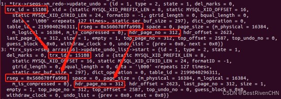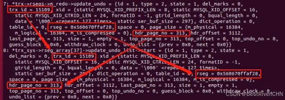 1、从全局变量trx_sys中的回滚段数组rseg_array中的回滚链表update-undo_list中指针(trx_sys->rseg_array[N]->update_undo_list->start)以及当前事务trx中的回滚段指针rsegs中的slot槽区m_redo中的undo log(trx->rsegs->m_redo->update_undo)都可以找到相应的回滚段中的回滚日志。