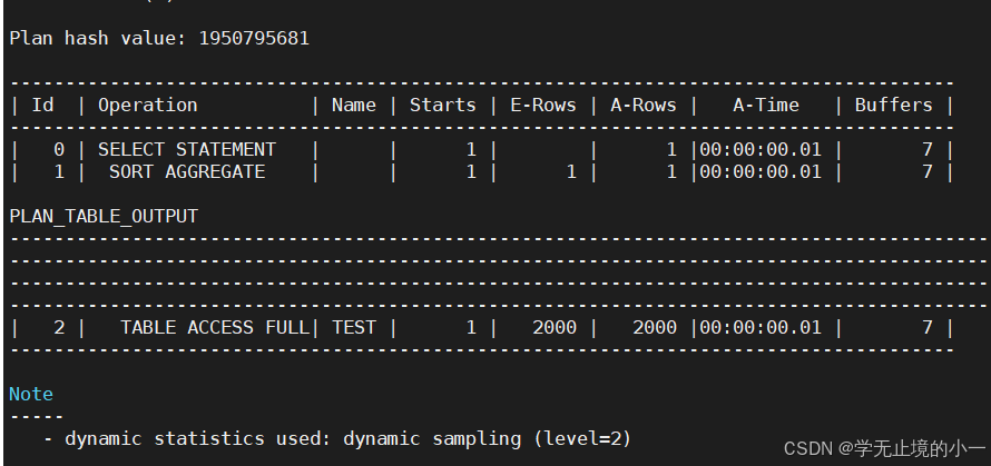 alter session set statistics_level = all; select count(*) from test; select * from table(dbms_xplan.display_cursor(NULL, NULL,'allstats last')); 或者在SQL语句中添加hint:/*+ gather_plan_statistics */ select /*+ gather_plan_statistics */ count(*) from test where owner='SYS'; select * from table(dbms_xplan.display_cursor(NULL, NULL,'allstats last'));