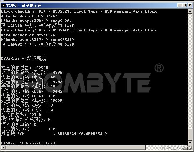 结果发现SYSAUX01.DBF文件数据块(Data)检测失败的页总数和索引页(Index)检测失败的页总数都有数十页,其他文件检测正常。