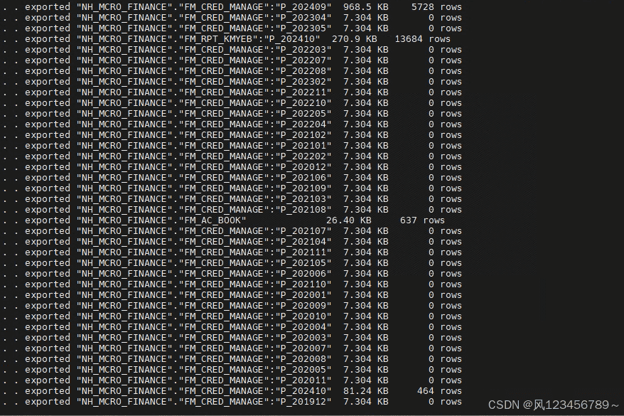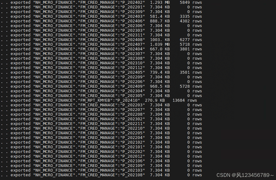 测试导出3个表:FM_AC_BOOK、FM_CRED_MANAGE、FM_RPT_KMYEB。其中后两个表为年月分区表,p_2024xx 分区命名。如下: