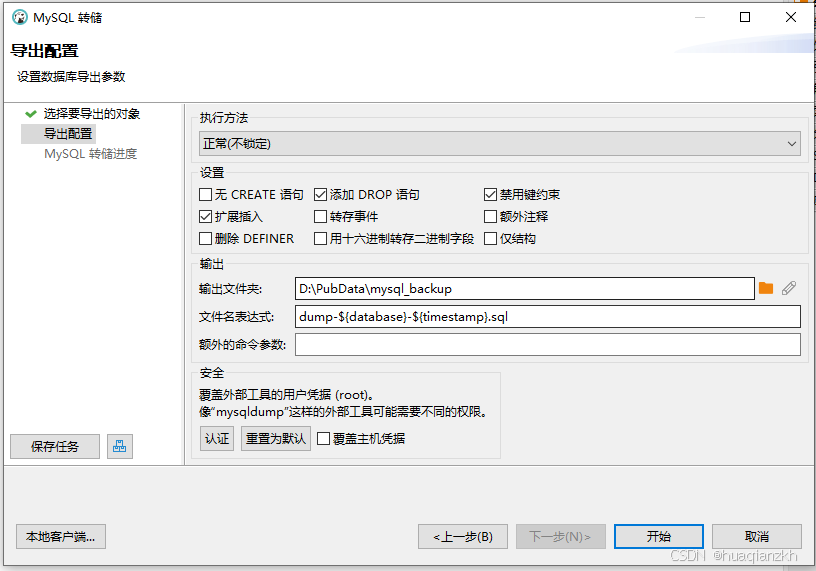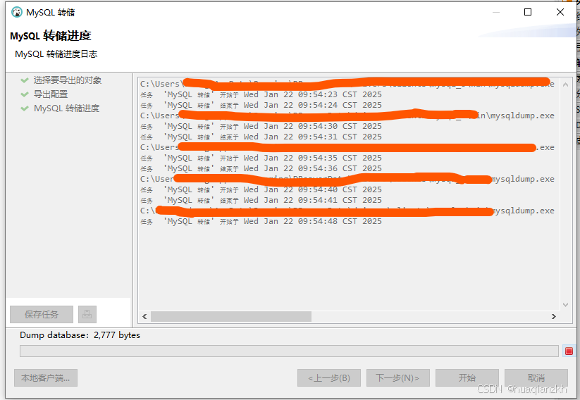 配置完成后,点击“开始”按钮。DBeaver将开始执行转储操作,并将数据库中的数据导出到指定的文件中。转储过程中,可以在进度条中查看操作的进度。当进度条达到100%时,表示转储操作完成。