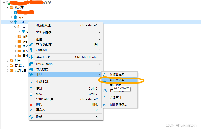 在左侧的数据库导航栏中,找到目标数据库,并右键点击该数据库。在弹出的菜单中选择“工具”,然后选择“恢复数据库”。