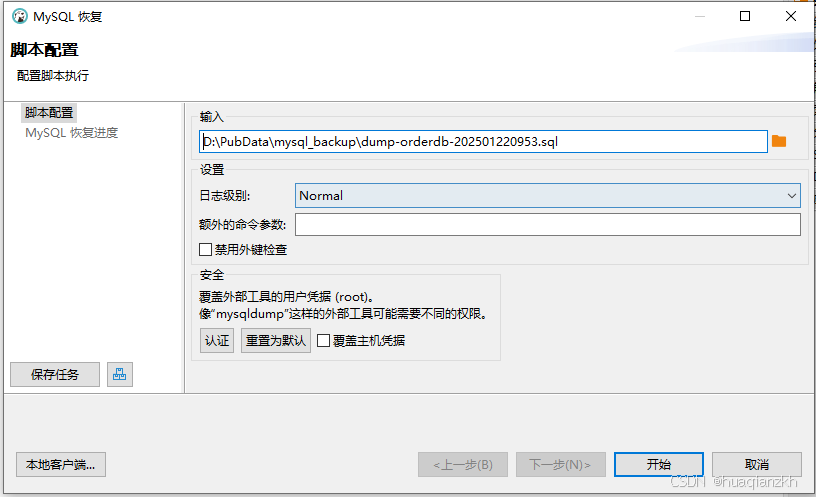 在选择转储文件后,可以配置一些恢复选项。例如,可以选择是否覆盖目标数据库中的现有数据、是否忽略错误等。根据实际需求配置好选项后,点击“开始”按钮。