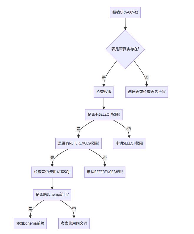 "ORA-00942: 表或视图不存在"错误通常不是简单的表不存在问题,而是涉及Oracle的编译机制、权限系统和对象引用规则。理解这些底层原理,并采用动态SQL、适当授权等解决方案,可以有效地避免和解决这类问题。